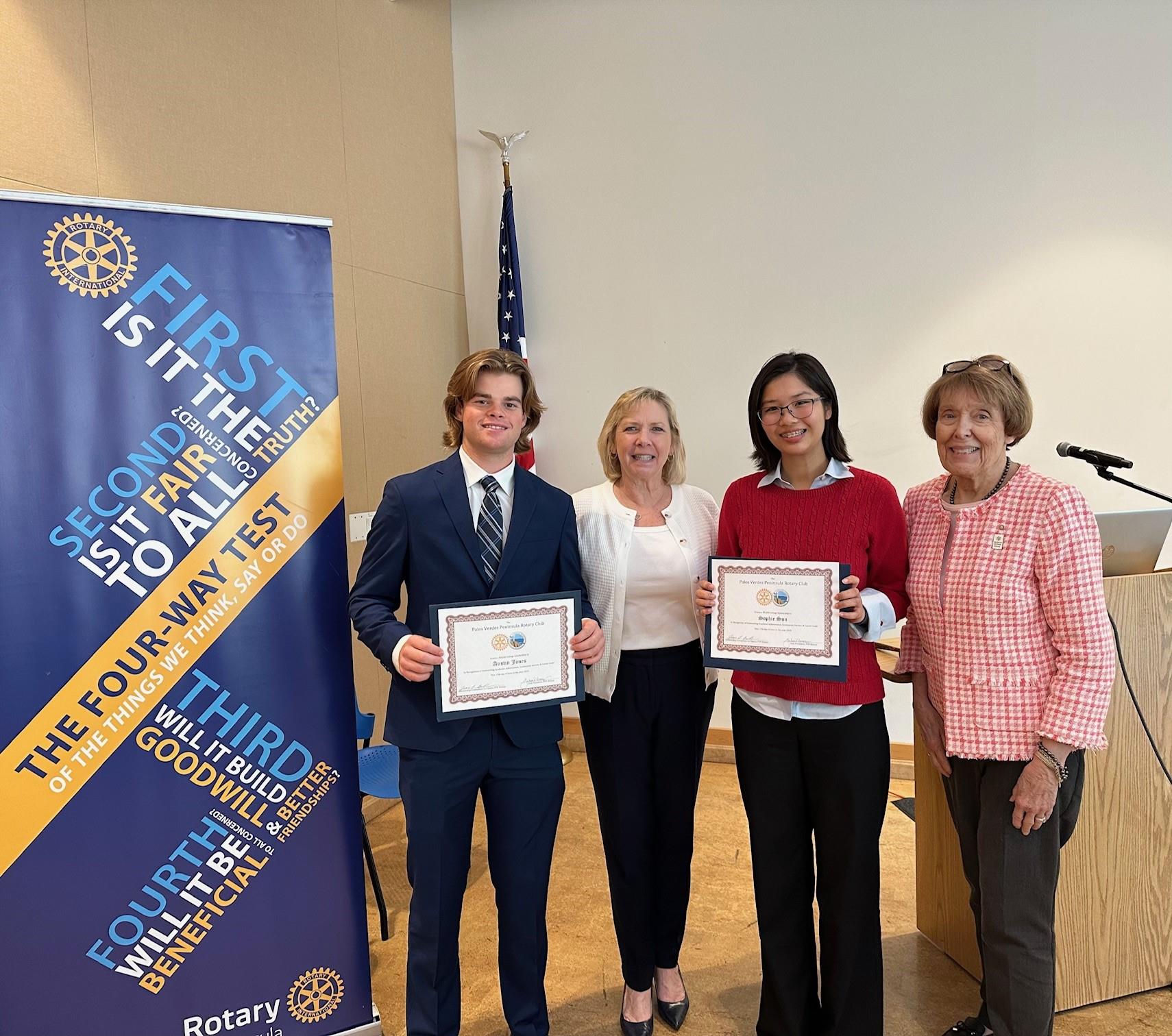 Our Club honored this year’s Rotary Scholarship recipients including Austin Jones (far left) and Sophie Sun (second from right), pictured with Julia Parton and Joan Behrens. Additional Scholarship recipients for this year (not shown) are Peter Chang and Christine Xie. Congratulations to these four outstanding scholars and community leaders!