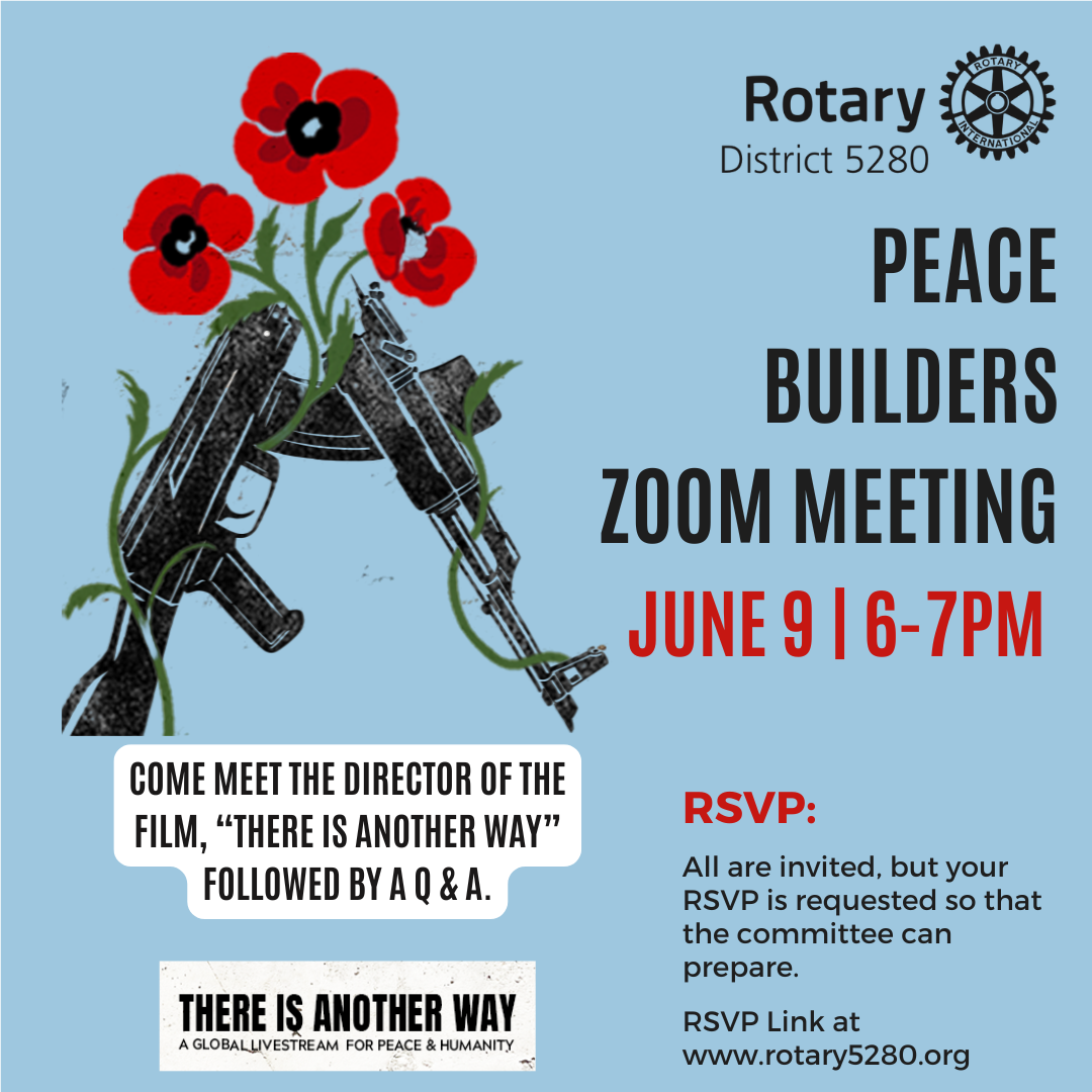 The D5280 Peace Builders committee invites anyone who is interested in furthering peace in our world to a virtual meeting on June 9. Stephen Apkon, the director of the film "There Is Another Way", will be joining us and it will include a Q & A. It’s 1 hour long zoom and we will be inviting our District to watch the livestream of the movie which will air on June 12th. The more people on the June 9th zoom the better. The world needs to see this movie on June 12th and this zoom will help us enroll people. What a great film to share with Rotarians around the world.